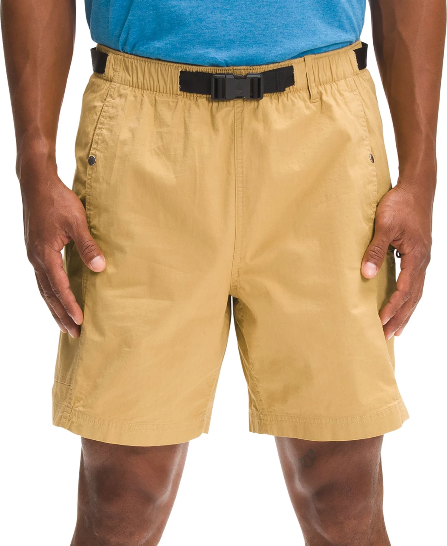 - Elasticated waistband with an integrated, partially exposed belt