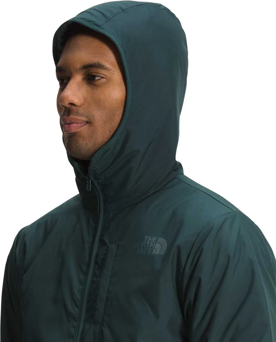 - Attached, three-piece hood with binding
